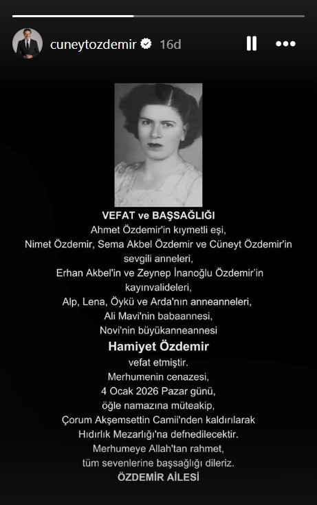 Son periyotta Youtube’da yaptığı yayınlarla meslek hayatını sürdüren sunucu ve muharrir Cüneyt Özdemir, annesi Hamiyet Özdemir’in ömrünü yitirdiğini duyurdu. Toplumsal medyada annesinin gençlik fotoğrafıyla yaptığı paylaşımda Özdemir, cenaze bilgilerini de paylaştı. 4 Ocak pazar günü, öğlen namazına müteakip Çorum Akşemsettin Camii’nden cenazesinin kaldırılacağını ve Hıdırlık Mezarlığı’na defnedileceğini belirtti.