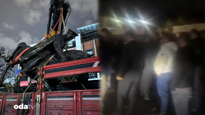 “Yangından mal kaçırırcasına Atatürk Anıtı’nı gece yarısı söküp araca yükleyerek götürmeye çalıştılar. Biz de bunu fark ederek buraya geldik ve müdahale ettik. Bu araçların buradan çıkmasına müsaade vermeyeceğiz. Bu kentin simgesi olan Atatürk Anıtı’nın böylesine yasa dışı yollarla kaldırılmasını kabul etmiyoruz. Atatürk’e, Cumhuriyet’e, vatana ve millete sahip çıkan herkesi bu alana davet ediyoruz. Gerekirse günlerce burada nöbet tutacağız”