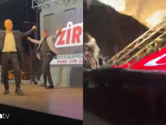 Aydın’ın Kuyucak ilçesindeki bir programda zeybek oynayan CHP’li Belediye Başkanı Uğur Doğanca sahneden iner inmez fırtına çıktı. Fırtınanın tesiriyle dev LED ekran sahneye devrilirken Doğanca’nın saniyelerle mevtten döndüğü o anlar kameraya bu türlü yansıdı.