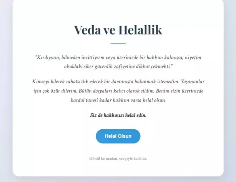 “Veda ve Helallik. Kırdıysam, bilmeden incittiysem yahut üzerinizde bir hakkım kalmışsa; niyetim okuldaki siber güvenlik zafiyetine dikkat çekmekti. Kimseyi bilerek rahatsız edecek bir davranışta bulunmak istemedim. Yaşananlar için çok özür dilerim. Bütün evrakları kalıcı olarak sildim. Benim sizin üzerinizde hardal tanesi kadar hakkım varsa helal olsun. Siz de hakkınızı helal edin”