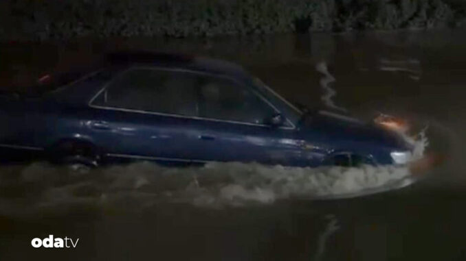 Görüntülerde arabanın, sel sularının ortasında neredeyse yüzerek ilerlediği ve etraftaki vatandaşların şaşkınlıkla durumu izlediği görülüyor.