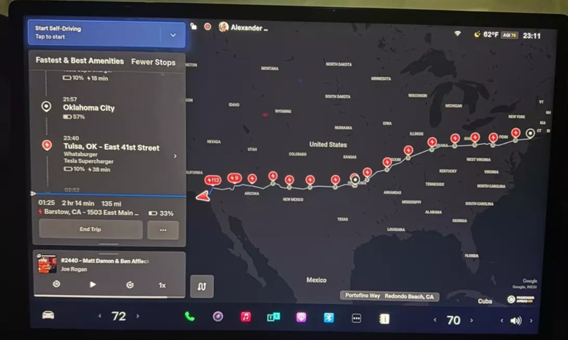 Otoyol ve kent içi yolları kapsayan seyahatte araç, direksiyon, fren ve sürat denetimini büsbütün kendi başına yönetti; sırf şarj molaları için durdu. Sürüş, Tesla’nın şimdiye kadarki en argümanlı otonom sürüş denemelerinden biri olarak bedellendiriliyor.